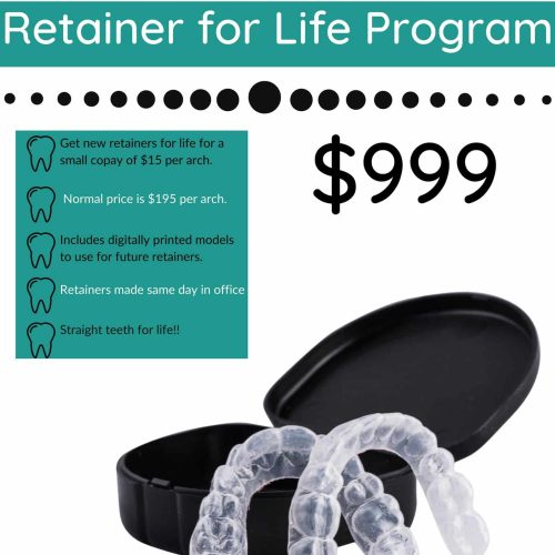 For $999 + tax, you can enroll in our Retainer For Life Program. This will allow you to have your retainers replaced at any time for a small copayment of $15 + tax per arch for clear retainers. The normal price for 1 arch is $195 + tax. We include digitally printed models of your teeth that we will use to make all future sets of retainers. This reduces office visits and allows us to make your retainers same day.